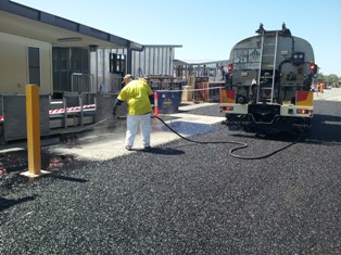 The below pictures are of a new Housing Estate where the works involved sweeping the surface to remove any loose road base, spraying a bituminous product thinned out to allow product to penetrate road base and left for 72 hours to cure. After the curing process the Estate road was completed with an asphalt overlay providing a smooth finish.
